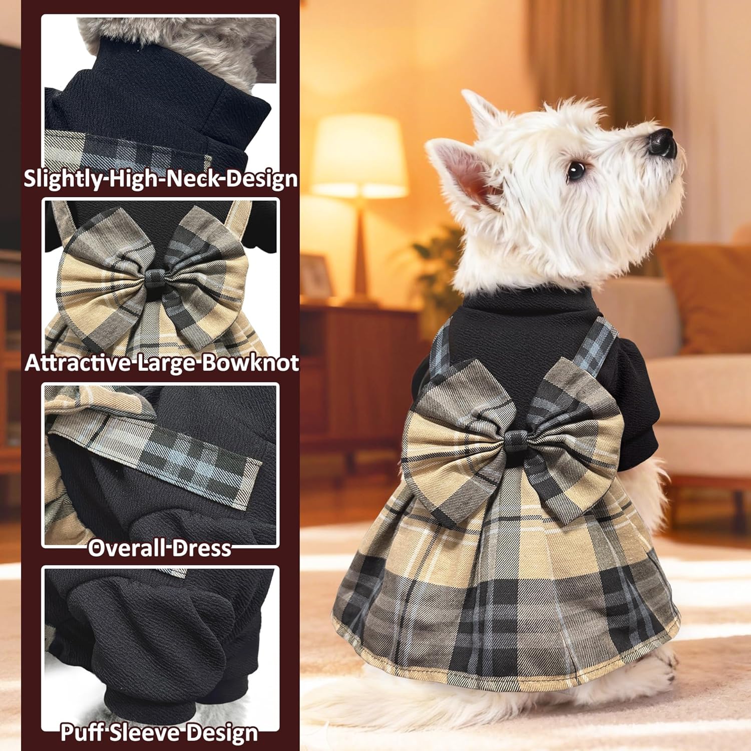 - 【Charming Vintage Design】This puppy dress featuring a classic plaid pattern,includes a stylish high collar and playful puff sleeves for a charming look. The attached big bow tie on the back adds a touch of elegance,making your furry friend look extra special and turn heads.