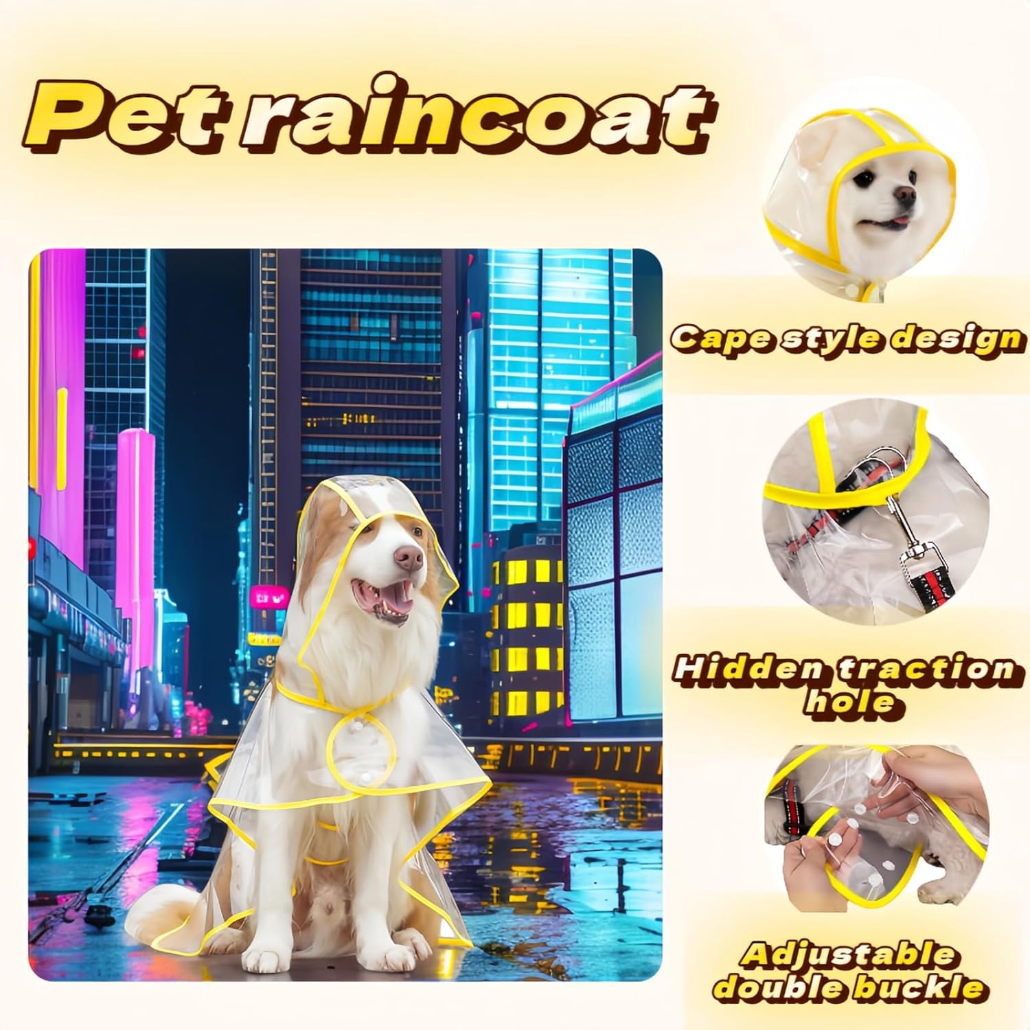 Clear Dog Raincoat, Transparent PVC Cape Style Pet Rain Jacket with Hidden Leash Hole, Adjustable Double Buckle for Small Dogs (Yellow, Medium)